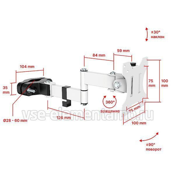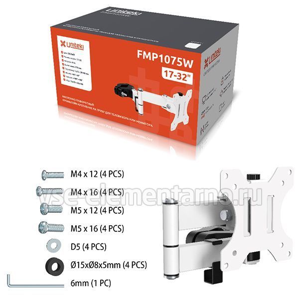 Наклонно-поворотный кронштейн Uniteki FMP1075W с возможностью крепления к трубе диаметром от 28 до 60 мм. Совместим с большинством LCD/LED телевизоров и мониторов диагональю от 17 до 32 дюймов и максимальным весом 8 кг.