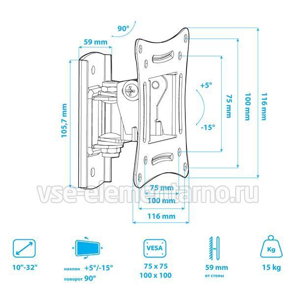 Настенный поворотно-наклонный кронштейн для телевизоров и мониторов с диагональю от 10 до 32 дюймов.