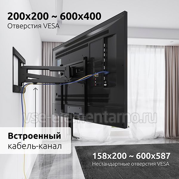 Также для удобства монтажа кронштейн Uniteki FMG33FIREPLACE укомплектован всем необходимым: кабель-каналом для аккуратной укладки кабелей, комплектом крепления к стене и к телевизору. Удобство использования кронштейна Uniteki FMG33FIREPLACE позволяет менять дистанцию удаленности телевизора от стены в диапазоне от 160 до 587 мм. Монтажные отверстия в кронштейне расположены в соответствии со стандартом VESA с максимальным расстоянием 600x400 мм.