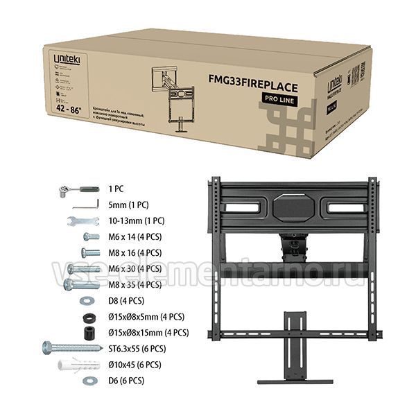 Кронштейн Uniteki FMG33FIREPLACE имеет увеличенное основание по размеру. Такое основание сконструировано для равномерного распределения нагрузки на стену и на кронштейн. Нагрузка на кронштейн от 13 до 33 кг.