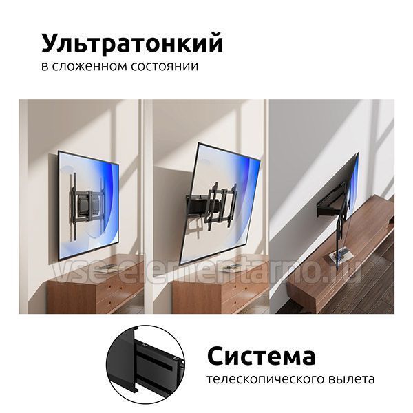 Настенный ультратонкий наклонно-поворотный кронштейн в чёрном цвете для телевизоров с диагональю от 37 до 120 дюймов.