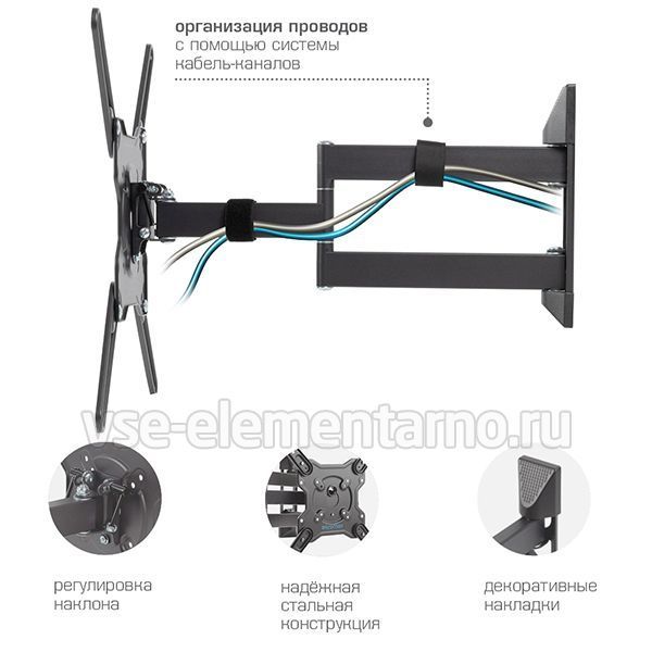 Система шарниров позволяет регулировать положение экрана телевизора, оптимизируя пространство помещения и добиваясь наиболее удобного расположения экрана для просмотра. В комплекте поставки крепления есть вся необходимая фурнитура для монтажа.
