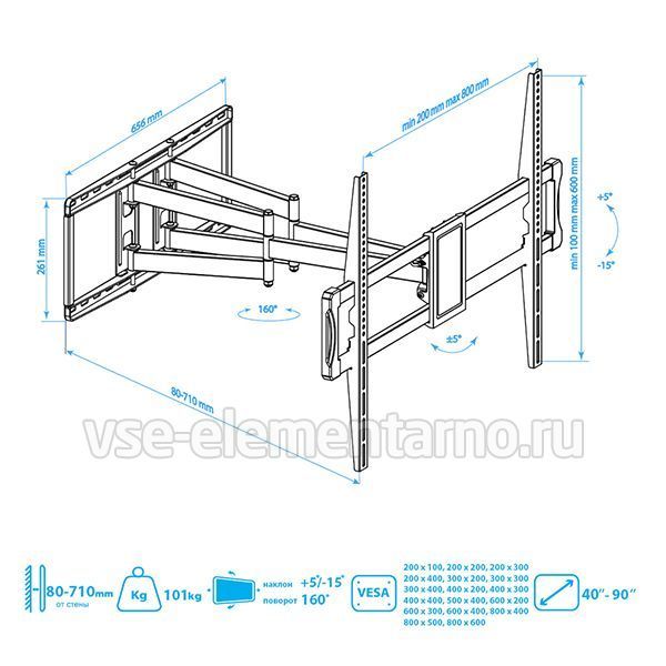 Сверхмощный настенный поворотно-наклонный кронштейн для телевизоров и мониторов с диагональю от 40 дюймов весом до 101 кг.