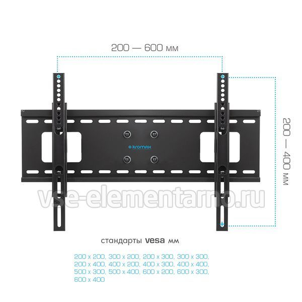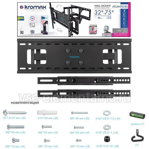Также для удобства монтажа кронштейн Kromax Atlantis-80 укомплектован всем необходимым: водяным уровнем (для точности монтажа), кабель-каналом для аккуратной укладки кабелей, комплектом крепления к стене и к телевизору. Удобство использования кронштейна Kromax Atlantis-80 обеспечено четырьмя подвижными «коленами», что позволяет менять дистанцию удаленности телевизора от стены в диапазоне от 100 до 484 мм. Монтажные отверстия в кронштейне расположены в соответствии со стандартом VESA с максимальным расстоянием 600x400 мм.