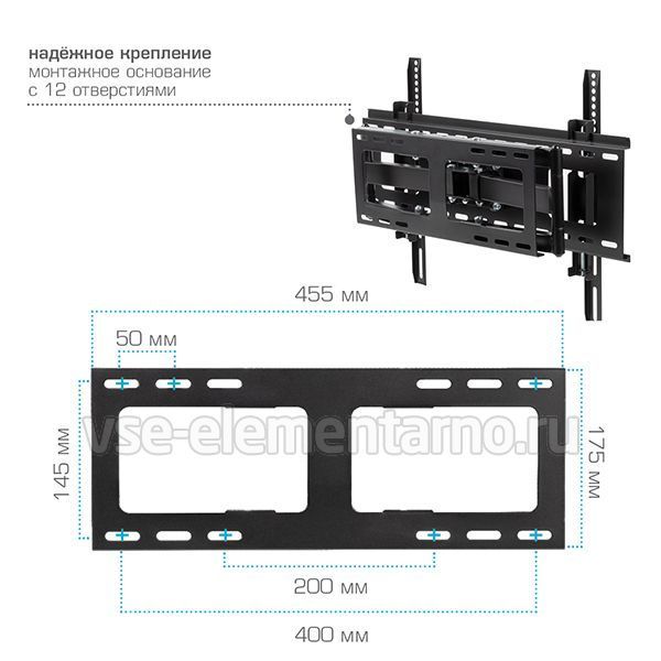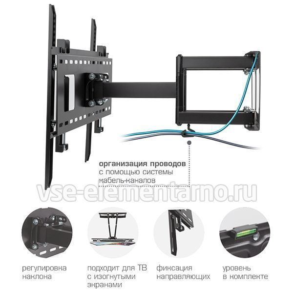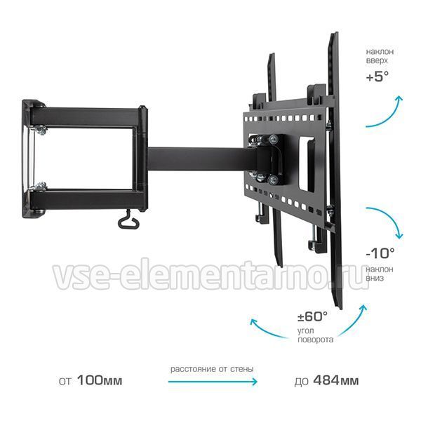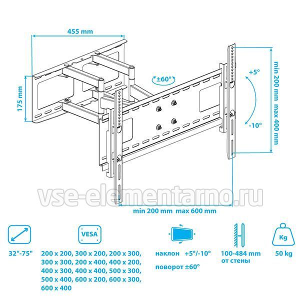 Настенный поворотно-наклонный кронштейн для телевизоров и мониторов с диагональю от 32 до 75 дюймов весом до 50 кг.