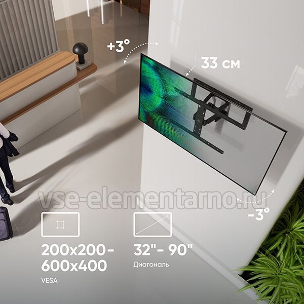Настенный поворотно-наклонный кронштейн для телевизоров и мониторов с диагональю от 32 до 90 дюймов.