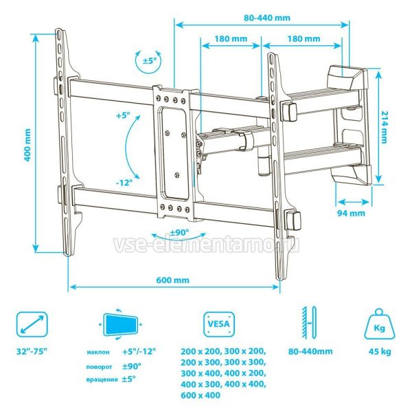 Настенный поворотно-наклонный кронштейн для телевизоров и мониторов с диагональю от 32 до 75 дюймов весом до 45 кг.