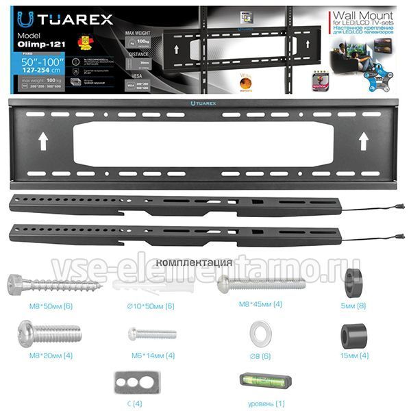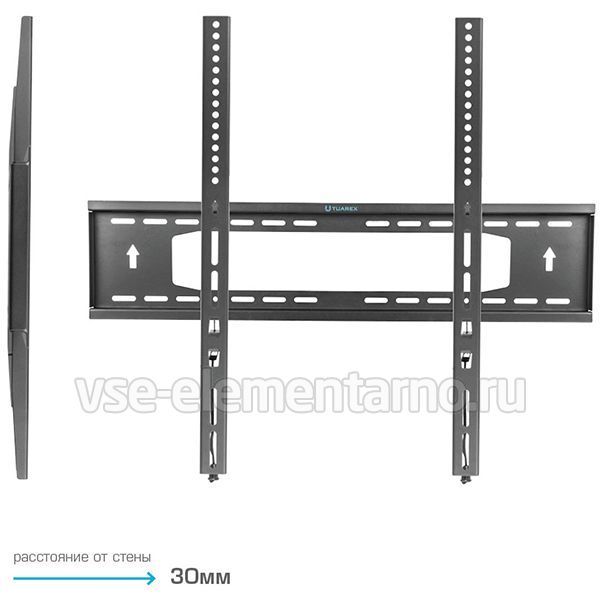 Универсальный кронштейн Tuarex Olimp-121 с надежной стальной конструкцией для телевизоров с диагональю от 50 до 100 дюймов. Максимальная нагрузка до 100 кг, минимальное расстояние от стены 30 мм.