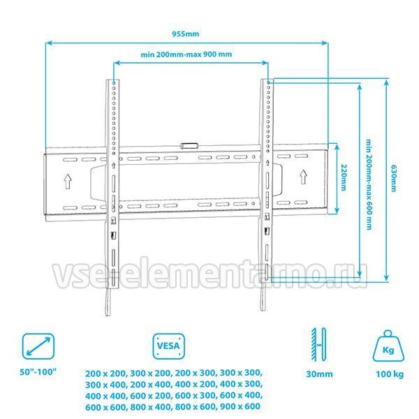 Настенный фиксированный кронштейн с минимальным расстоянием до стены для телевизоров с диагональю от 50 до 100 дюймов.