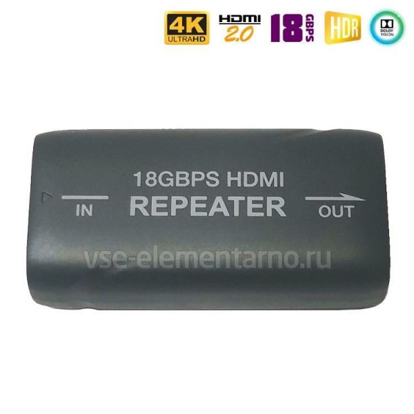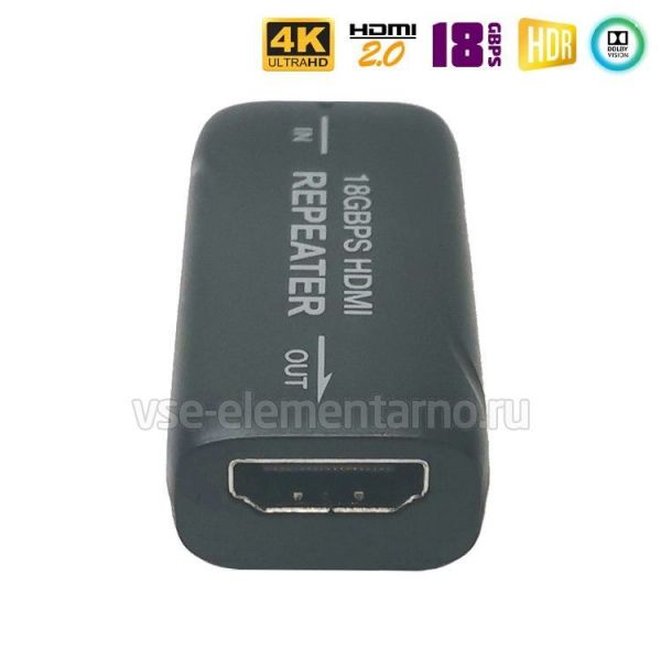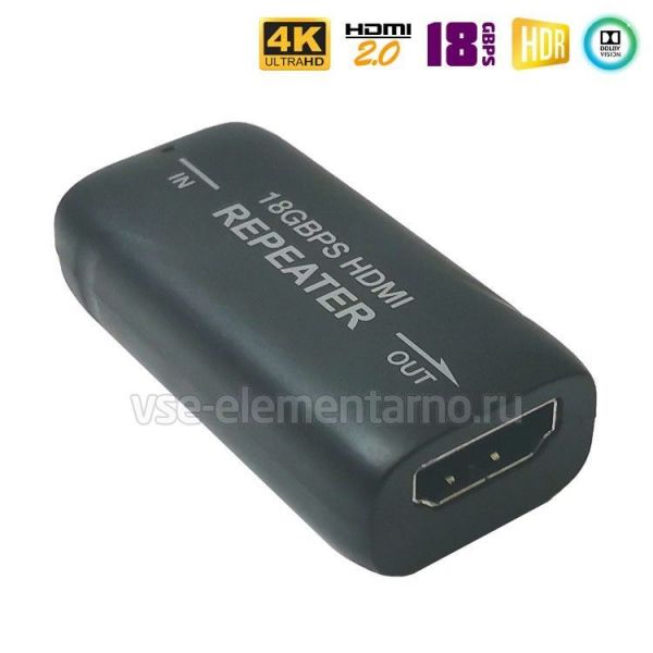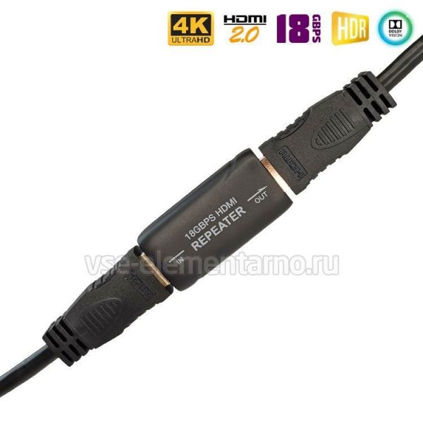 Если вам необходимо соединить два HDMI кабеля, то вам необходим HDMI репитер. В отличие от простого переходника репитер (от англ. repeat - повторять) с помощью встроенного эквалайзера, автоматически контролирует силу сигнала и может усиливать или выравнивать его. Никаких настроек не требуется: просто подключите два кабеля максимальной длиной 10 метров каждый к соответствующим разъемам. Обратите внимание, что репитер - строго направленный. В разъем IN подключается кабель от источника сигнала, а в разъем OUT кабель от потребителя (телевизора, монитора, проектора и т.п.).