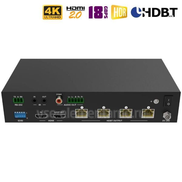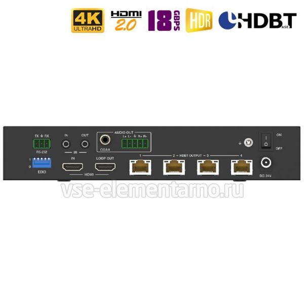 - Выходные интерфейсы: 1x HDMI, 4x HDBaseT [RJ45], 1x Coaxial, 1x L/R Audio OUT [5-pin Phoenix]