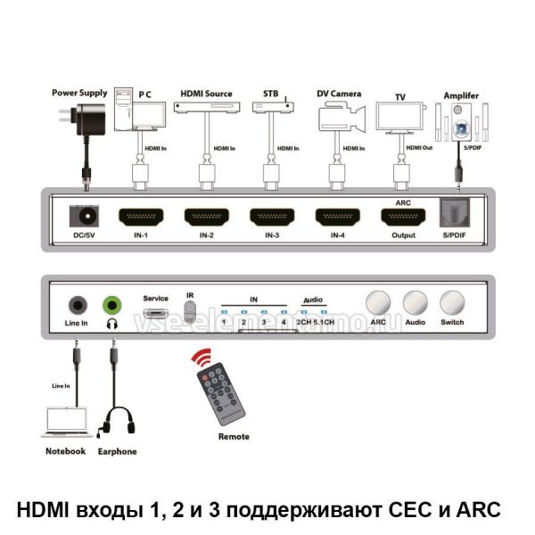- Петлевой ARC (можно вывести звук с ТВ для подключения саундбара) HDMI In1,In2,In3