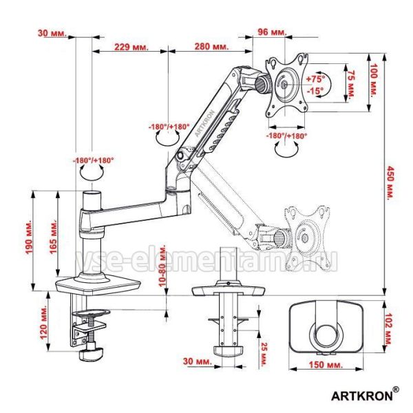Крепление для монитора ARTKRON ART-K1 чёрного цвета рассчитан для мониторов со стандартом 75х75, 100х100 мм., весом от 2 до 11 кг. радиусом изгиба монитора от 4000R до 1800R. Кронштейн ART-K1 поможет вам организовать рабочее место за счёт возможности придания монитору множества степеней свободы.