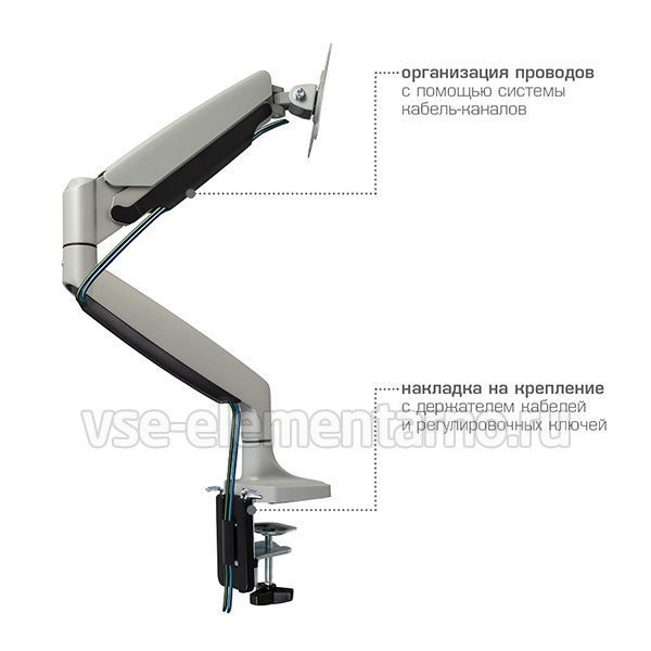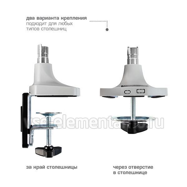 В конструкции кронштейна Kromax Office-21 предусмотрены скрытые каналы для укладки всех соединительных проводов. Два варианта крепления к столу: зажим к краю стола и крепление на поверхность стола.