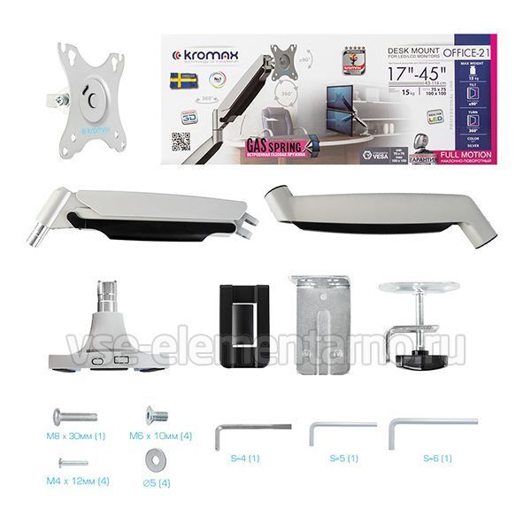 Настольный кронштейн Kromax Office-21 идеально подходит для всех мониторов с диагональю экрана от 17 до 45 дюймов (44-114 см) и весом от 1 до 15 кг. Кронштейн Kromax Office-21 позволяет легко и плавно изменять ориентацию монитора вертикально / горизонтально за счет газового амортизатора, который настраивается под вес любого монитора. Монитор дополнительно можно наклонять, поворачивать и вращать на 360°. Радиус изгиба монитора от 4000R до 1800R.