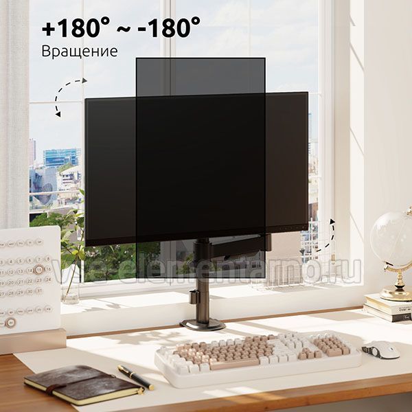 Кронштейн Uniteki FMGT91PIPE позволяет легко и плавно изменять ориентацию монитора вертикально / горизонтально за счёт газового амортизатора, который настраивается под вес любого монитора. Монитор дополнительно можно наклонять, поворачивать и вращать на 360°.