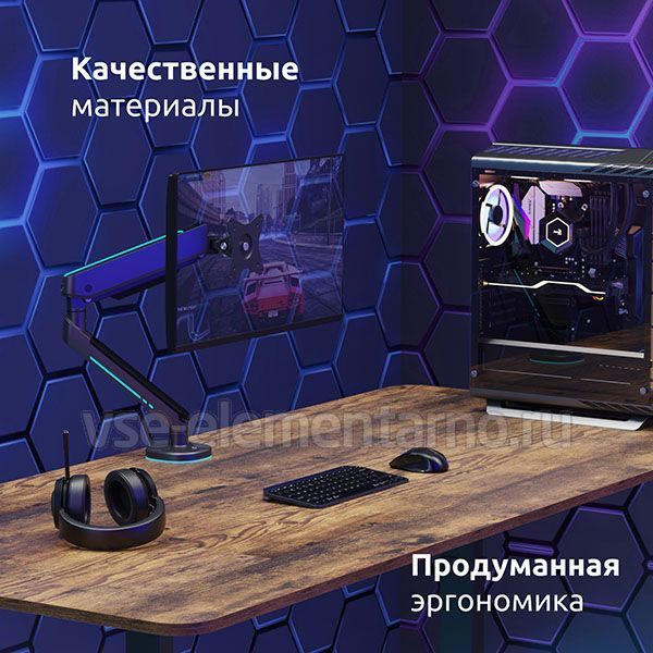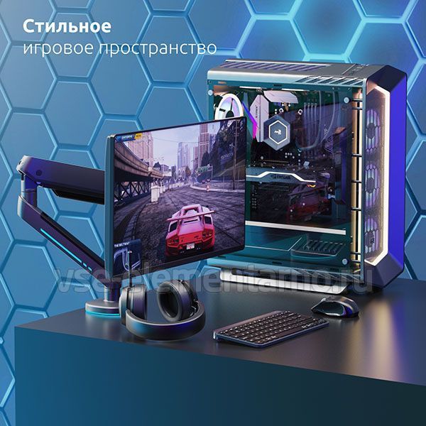 Стильный, геймерский дизайн, алюминиевый корпус с кабель-каналами из прочного ABS пластика, удобно расположенная кнопка для управления RGB подсветкой и быстросъемная пластина VESA.