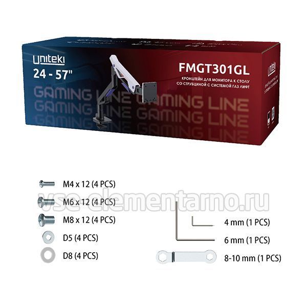 Настольный кронштейн Uniteki FMGT301GL идеально подходит для всех мониторов с диагональю экрана от 24 до 57 дюймов (61-145 см) и весом от 2 до 30 кг (на изогнутый экран от 2 до 24 кг). Радиус изгиба монитора от 4000R до 1800R.