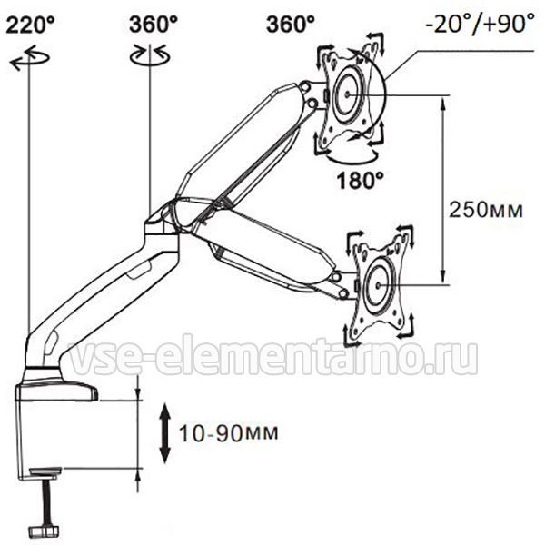 В конструкции кронштейна 2MVESA Dynamica D310 предусмотрены скрытые каналы для укладки всех соединительных проводов. Крепление к столу: зажим к краю стола.