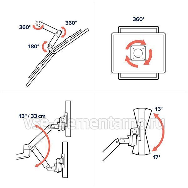 Степени свободы крепления Ergotron HX Desk Dual Monitor Arm (45-489-026):