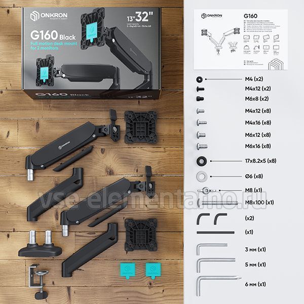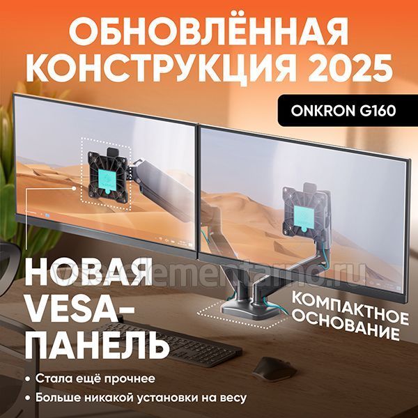 Кронштейн Onkron G160 не оставит никого равнодушным не только потому, что на него можно установить сразу 2 монитора, он подходит для всех мониторов и телевизоров, диагональю от 13" до 32" и весом от 2 кг до 8 кг, но и потому, что позволяет легко и просто передвигать монитор в любых плоскостях, и даже менять его положение по вертикали! Всё это благодаря газовой пружине, располагающейся внутри корпуса кронштейна Onkron G160 , именно она может зафиксировать монитор в любом положении и менять его не прилагая существенных усилий. Поворачивайте монитор вокруг своей оси на 360°, наклоняйте вверх и вниз, придвигайте или удаляйте от себя, поднимите монитор повыше или опустите пониже – всё это может наш кронштейн Onkron G160.