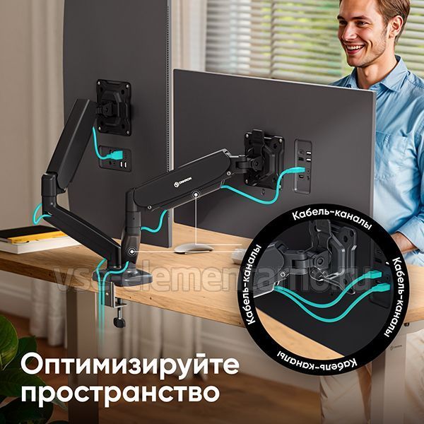 Настольный панорамный поворотно-наклонный кронштейн для двух мониторов с диагональю до 32 дюймов включительно c возможностью регулировки по высоте.