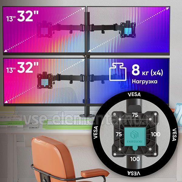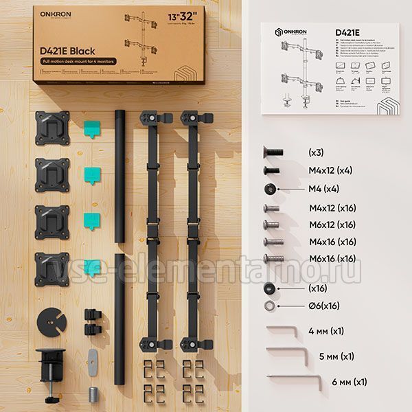 Настольный кронштейн Onkron D421E рассчитан на установку на любых столах и поверхностях, толщиной не более 100 мм, четырёх телевизоров или мониторов диагональю от 10" до 32" одновременно.