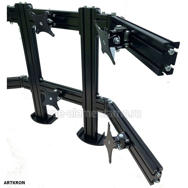 Кронштейн ARTKRON 424ST позволяет установить в два ряда 6 мониторов в изогнутой конфигурации. Максимальная полезная нагрузка составляет 48 кг (4 мониторов по 12 кг). Поддерживаются стандарты VESA от 75х75 до 100х100 мм.