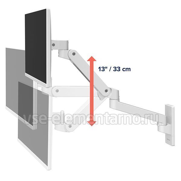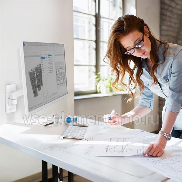 Настенный поворотно-наклонный кронштейн в белом цвете c регулировкой по высоте для монитора с диагональю до 34 дюймов включительно.