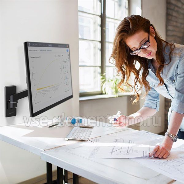Настенный поворотно-наклонный кронштейн в чёрном цвете c регулировкой по высоте для монитора с диагональю до 34 дюймов включительно.