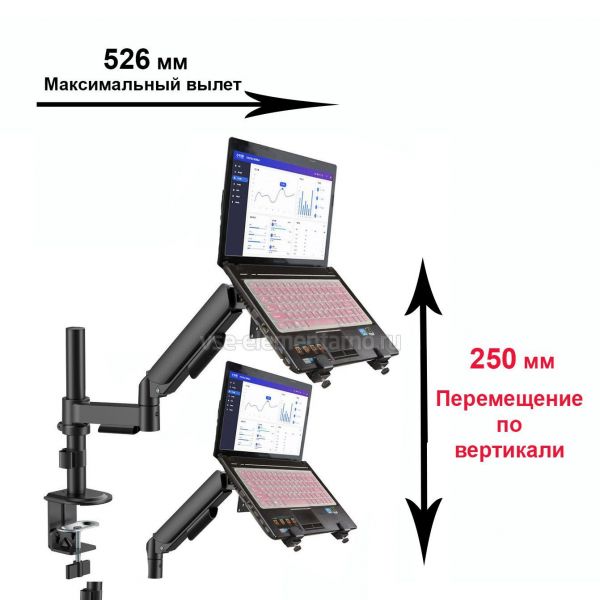 Плавное и лёгкое движение кронштейна влево и вправо, вперёд и назад, вверх и вниз, а также фиксация в любом промежуточном положении; Стальная конструкция высокой прочности, обрамлённая эффектным корпусом; Компактный корпус освободит много места и позволит перемещать ноутбук в любое положение; Система скрытой укладки кабеля внутри корпуса кронштейна; Лёгкая и быстрая установка.