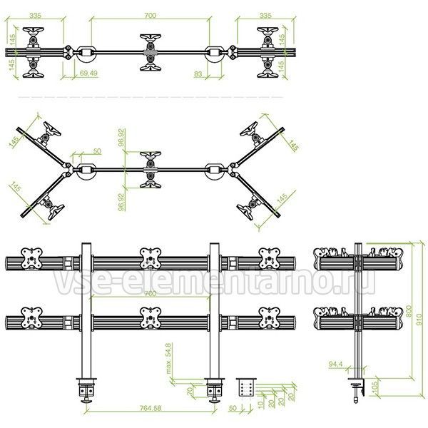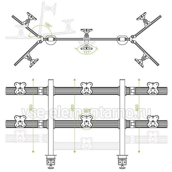 Доступна регулировка высоты в пределах 80 см, вращение на 360 градусов и наклон до ±35 градусов. Используется крепление типа струбцина, не требующее сверления отверстий. Максимальная нагрузка 144 кг.