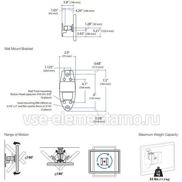 Настенный поворотно-наклонный кронштейн для монитора с диагональю до 27 дюймов включительно.