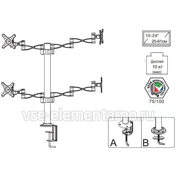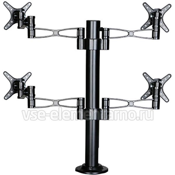 Настольный наклонно-поворотный кронштейн для четырёх мониторов с диагональю до 24 дюймов включительно с регулировкой по высоте.
