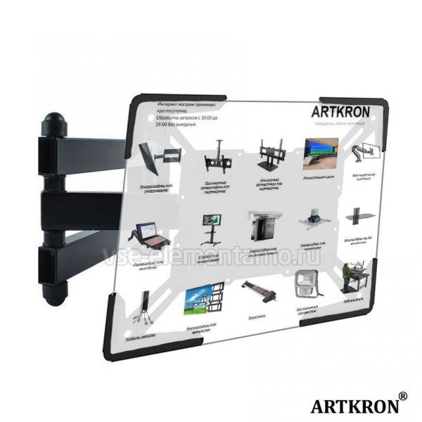 Универсальный настенный кронштейн для планшетов ARTKRON UTSW-15 совместим со всеми портативными популярными устройствами от 10" до 13", например с такими как: для iPad, Galaxy Tab, Xperia Tablet и с многими другими планшетами. Кронштейн позволяет легко менять ориентацию планшета из альбомного в портретное, поворот влево-вправо осуществляется на 180°. Планшет поворачивается в портретную/альбомную ориентацию на 360°; Расстояние от стены регулируется от 80 до 330 мм; Вращение экрана на -180°/+180°; Регулировка наклона: - 10°/+3°; Регулировка поворота: -90 +90°; Максимальная нагрузка: 3 кг
