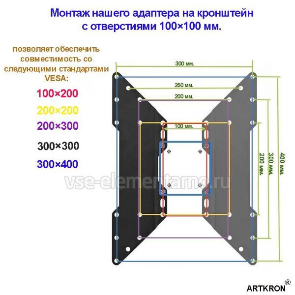 Универсальный адаптер для увеличения посадочных отверстий кронштейна со стандарта VESA 200х200 мм., до стандарта VESA VESA 300x200/300x300/400x200/400x300/400x400 мм.