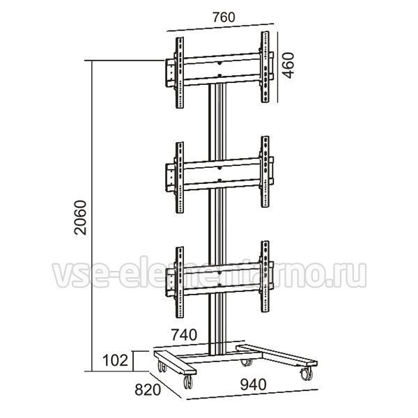 Мобильная стойка для видеостены 2MVESA Panorama 300 для 3 панелей (3 в высоту) с диагональю 30-55" и весом до 120 кг. Крепления поддерживают VESA 600x400 и могут регулироваться по высоте на 15 мм и в глубину на 15 мм. Такая точная регулировка позволяет собрать видеостену без зазоров между экранами и получить целостное изображение.