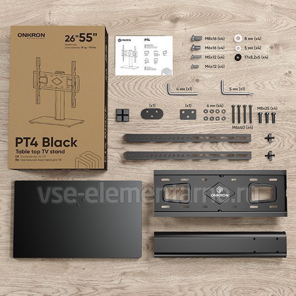 Подставка Onkron PT4 оснащена предварительно отсортированными крепежными элементами, что обеспечивает быструю и легкую инсталляцию. Максимальные посадочные размеры по горизонтали составляют 400 мм, по вертикали – 400 мм.