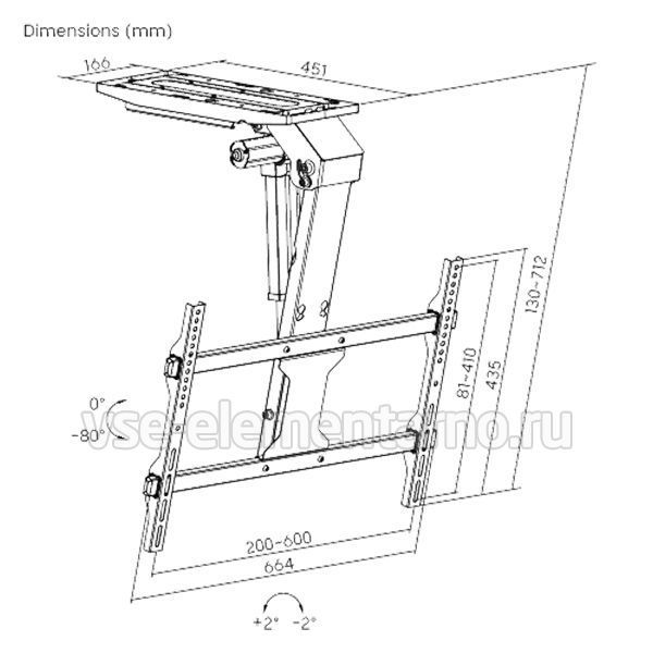Откидной потолочный моторизированный кронштейн PLB-M0746 может крепиться на наклонную поверхность. Угол наклона телевизора регулируется в пределах 80 градусов.
