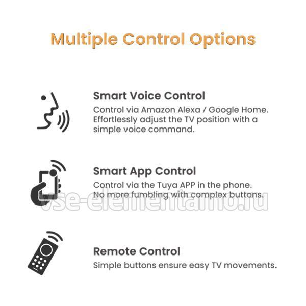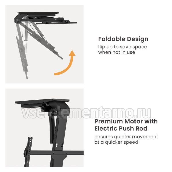 Особенности: Пульт дистанционного управления и возможность подключения к системе умного дома Tuya Регулировка угла откидывания и поворота: для нескольких углов обзора экрана Откидная конструкция: обеспечивает удобство хранения, освобождает пространство и обеспечивает безопасность в труднодоступных местах. Система предотвращения столкновений: защита от несчастных случаев и травм Мощный двигатель: стабильный, прочный и долговечный Регулировка уровня: позволяет идеально расположить телевизор после его установки на кронштейн.