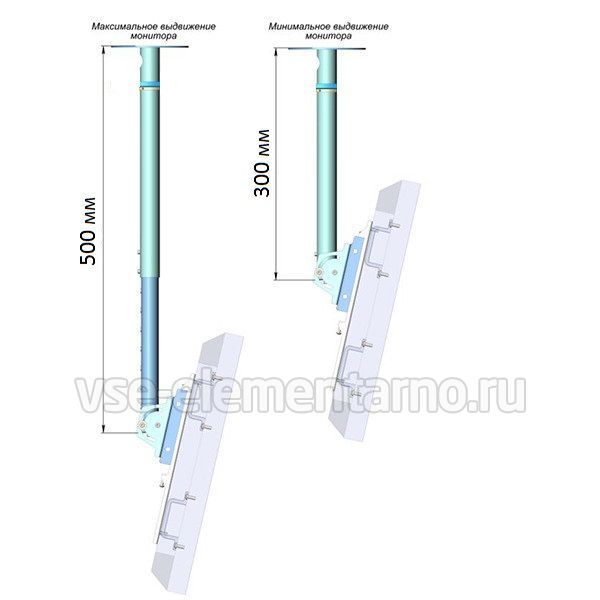 Потолочный кронштейн для телевизора с регулируемым расстоянием от потолка (300-500 мм) и углом наклона до 90°. Кронштейн изготовлен из металла и предназначен для использования, например, в стоматологических кабинетах. Пациенту не потребуется поворачивать голову для удобного просмотра видео на экране. Экран телевизора на кронштейне будет расположен максимально удобно для просмотра.