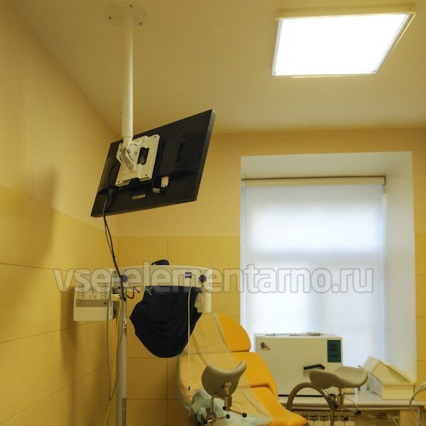 Потолочный кронштейн для телевизора с регулируемым расстоянием от потолка (1200-1800 мм) и углом наклона до 90°. Кронштейн изготовлен из металла и предназначен для использования, например, в стоматологических кабинетах. Пациенту не потребуется поворачивать голову для удобного просмотра видео на экране. Экран телевизора на кронштейне будет расположен максимально удобно для просмотра.