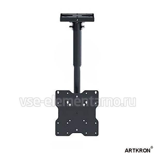 Потолочный кронштейн в чёрном цвете для телевизоров и мониторов с диагональю от 26 до 40 дюймов c возможностью размещения телевизора параллельно полу в комплекте с декоративным потолочным фланцем.
