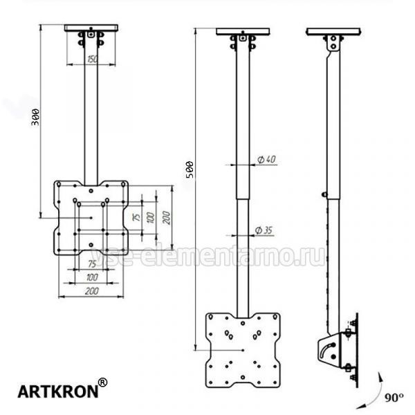 Потолочный кронштейн для телевизора ARTKRON DNT-20 имеет следующие функции: регулировка расстояния от потолка (300-500 мм) и регулировка угла наклона до 90°.