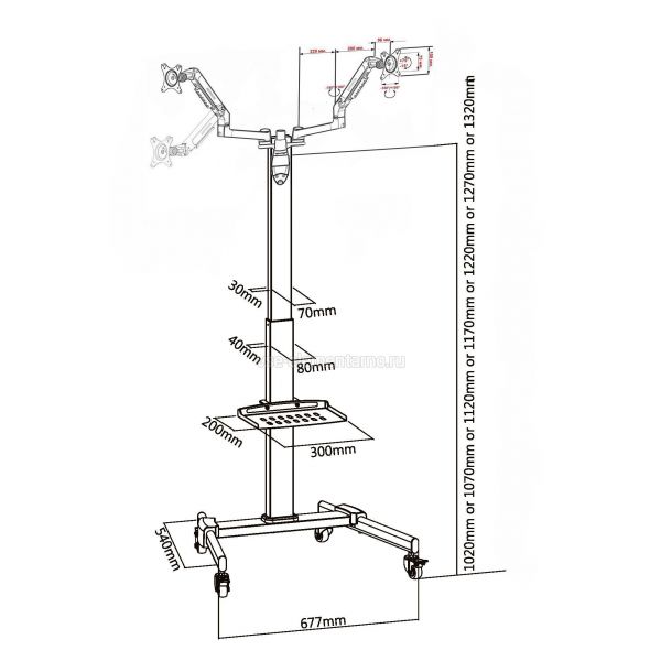Мобильная стойка с изменяемой высотой для двух мониторов диагональю от 10 до 32 дюймов.