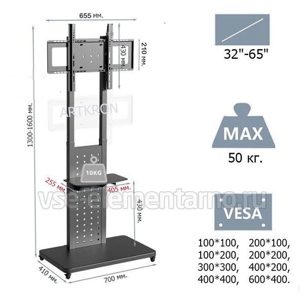 Мобильная стойка ARTKRON Stand-50 с настраиваемой ориентацией на подшипнике, подойдёт для всех типов современных телевизоров. Она разработана для размещения панели в портретной или альбомной ориентации. Подойдет для установки панели в информационных целях, например: в торговых залах, аэропортах, вокзалах, а также для офиса, чтобы проводить презентации, выставки и видеоконференции.