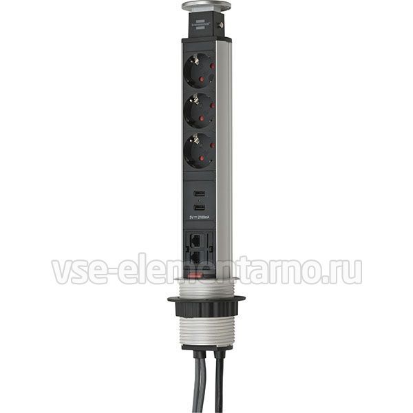 Выдвижной удлинитель серии Alu-Tischstedo, встраиваемый в столешницу или кухонный шкаф. 3 розетки, 2-портовый USB, RJ45 x2, 2 метра, чёрный цвет.